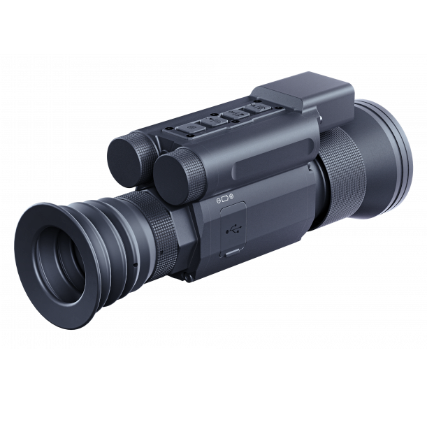Прибор — цифровая камера в форм-факторе прицела, регистрирующая тепловое излучение в диапазоне 8-14 мкм. Предназначен для установки на охотничье огнестрельное оружие. Позволяет измерять расстояние до 1000 м, вести фото- и видеосъемку (со звуком) на съемную карту памяти, передавать данные по Wi-Fi, micro HDMI и USB-C.